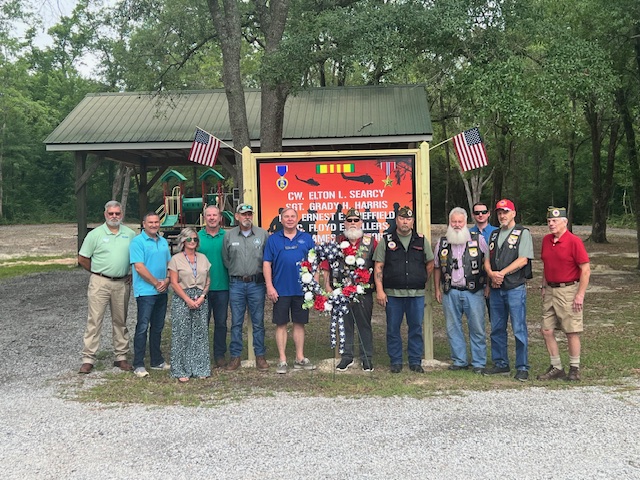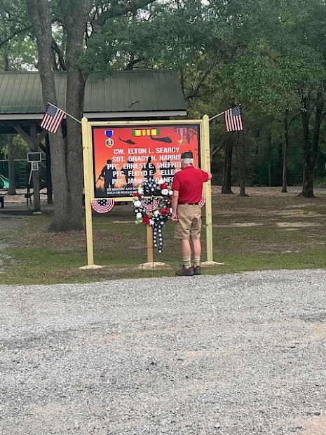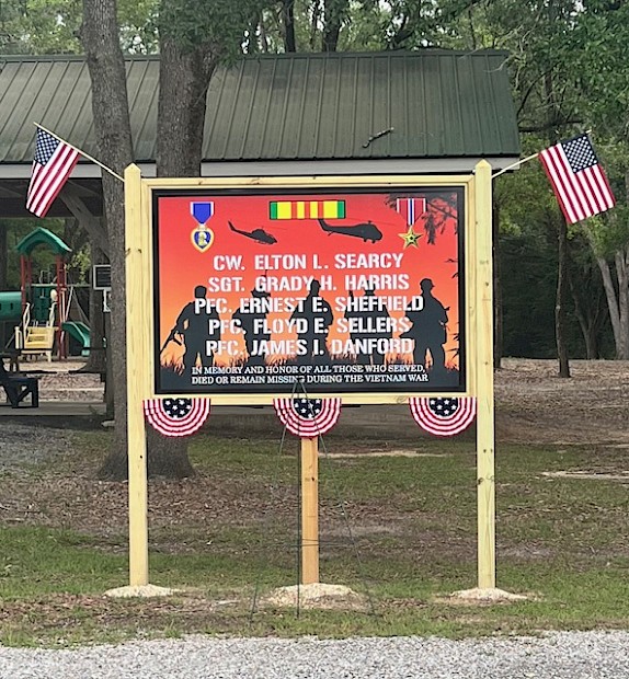 A special thanks to all who volunteered their services and donated to the cause. AMVETs Veterans Post 007 Chipley provided the flags, flagpole, and preformed a taps ceremony. Blossoms donated the patriotic silk wreath, Robert Pettis and Nevil Brock for the sign frame, and Community South Bank donated the solar lights that will light up the sign at night.