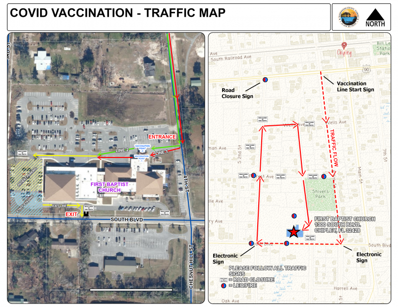 This is a drive through site. Road closures will not occur before 8AM. 3rd Street, 4th Street, Wells Avenue, and Forrest Avenue in Chipley will be closed to through traffic. Traffic flow information will be posted, and access will be maintained for residents of the area.